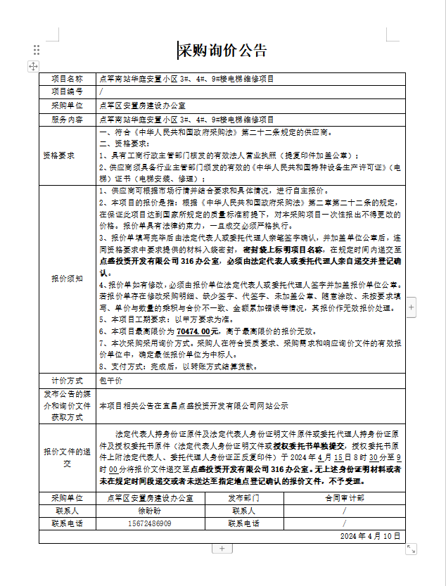 點軍南站華庭安置小區(qū)3#、4#、9#樓電梯維修項目詢價公告