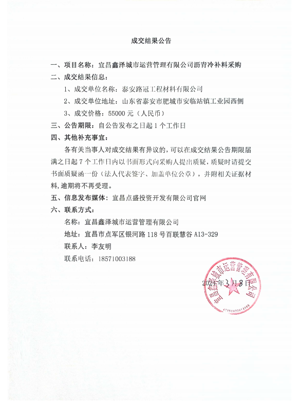宜昌鑫澤城市運營管理有限公司瀝青冷補料采購項目成交公告