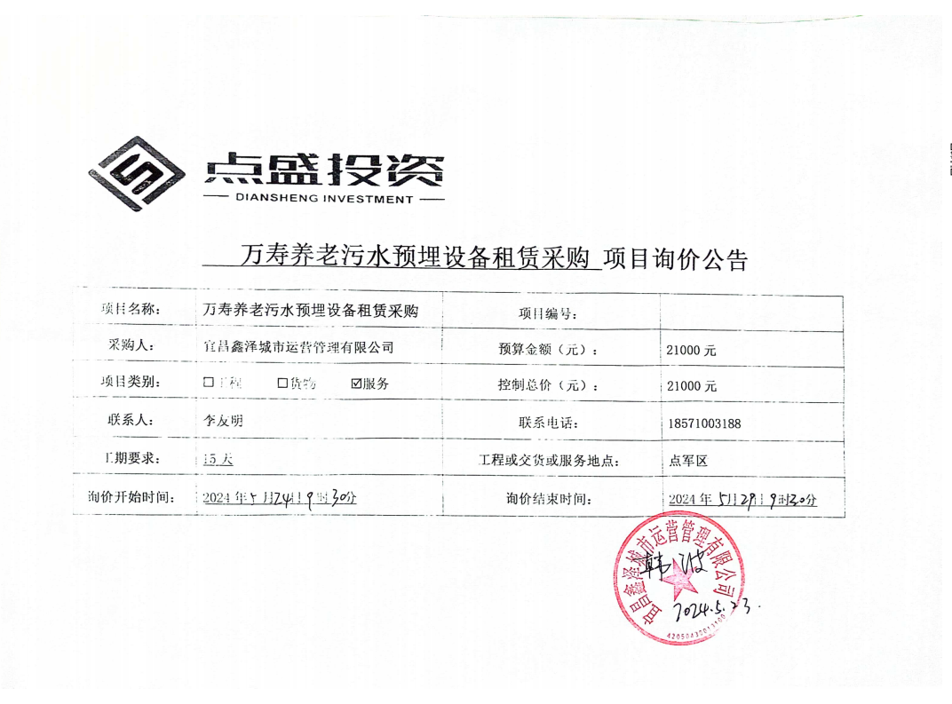 萬(wàn)壽養(yǎng)老污水預(yù)埋設(shè)備租賃采購(gòu)詢價(jià)公告