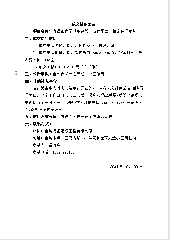 宜昌市點軍城鄉(xiāng)建設開發(fā)有限公司檔案整理服務成交公告