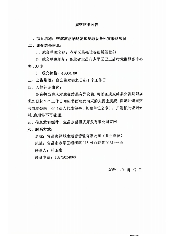 李家河銷鈉場(chǎng)復(fù)墾復(fù)綠設(shè)備租賃采購(gòu)項(xiàng)目成交公告