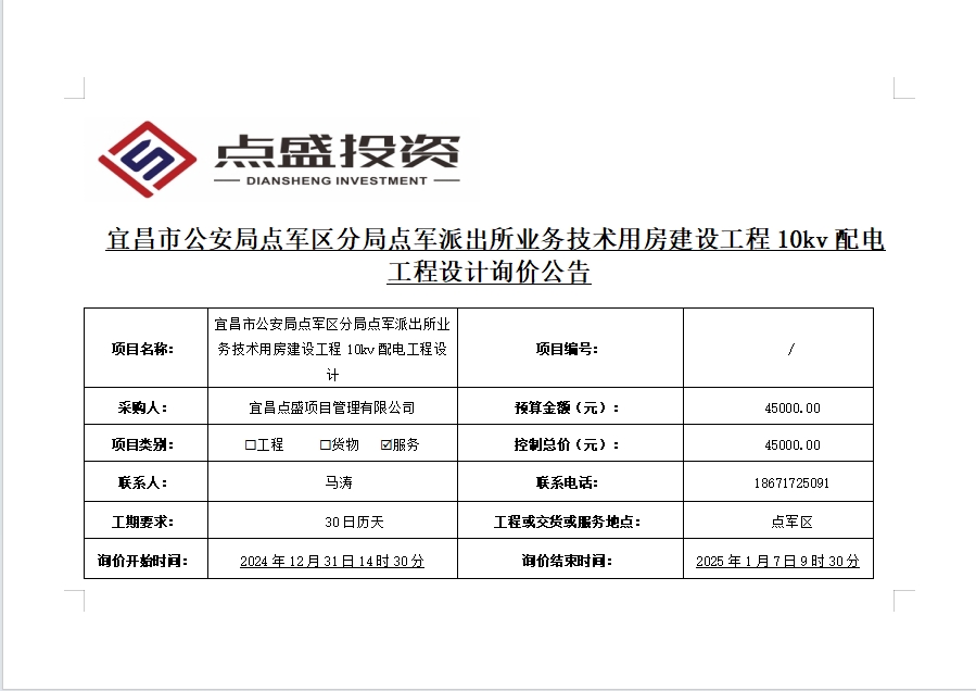 宜昌市公安局點軍區(qū)分局點軍派出所業(yè)務(wù)技術(shù)用房建設(shè)工程10kv配電工程設(shè)計詢價公告