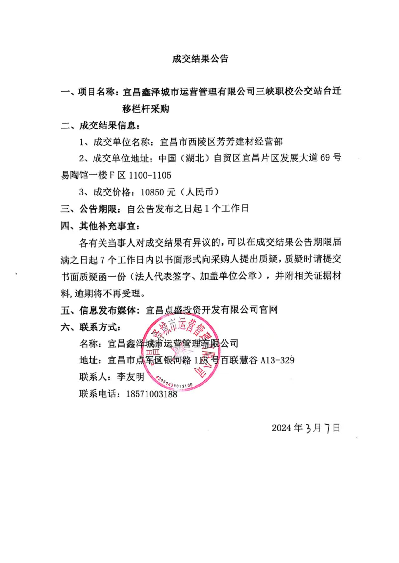 三峽職校公交站臺遷移欄桿采購成交公告